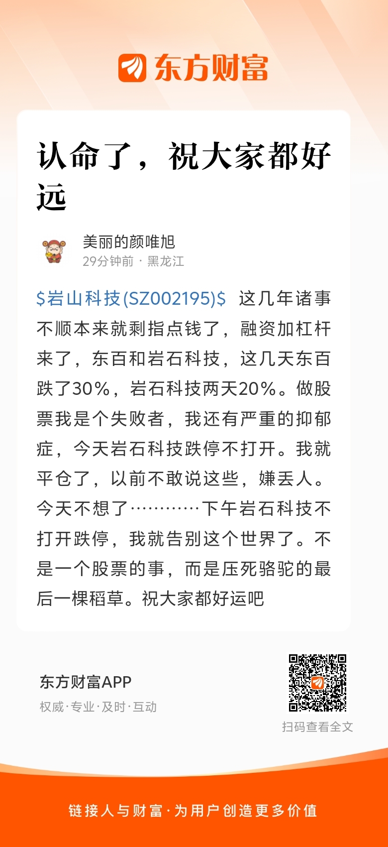 温馨提示: 1.根据《证券法》规定,禁止编造、传播虚假信息或者误导性信息,扰乱证券市场;2.用户在本社区发表的所有资料、言论等仅代表个人观点,与本网站立场无关,不对您构成任何投资建议。用户应基于自己的独立判断,自行决定证券投资并承担相应风险。《东方财富社区管理规定》