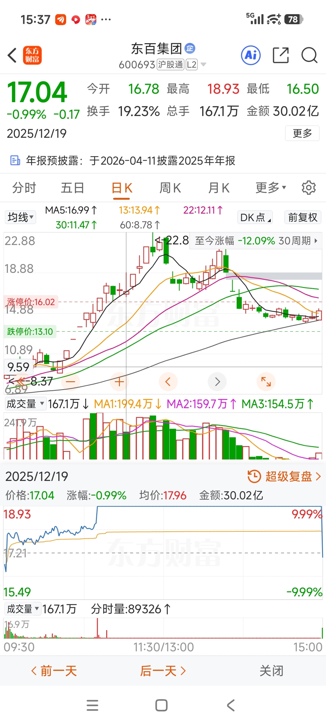$东百集团(SH600693)$ 12月19日分时不是涨停的,复里怎么是涨停的?