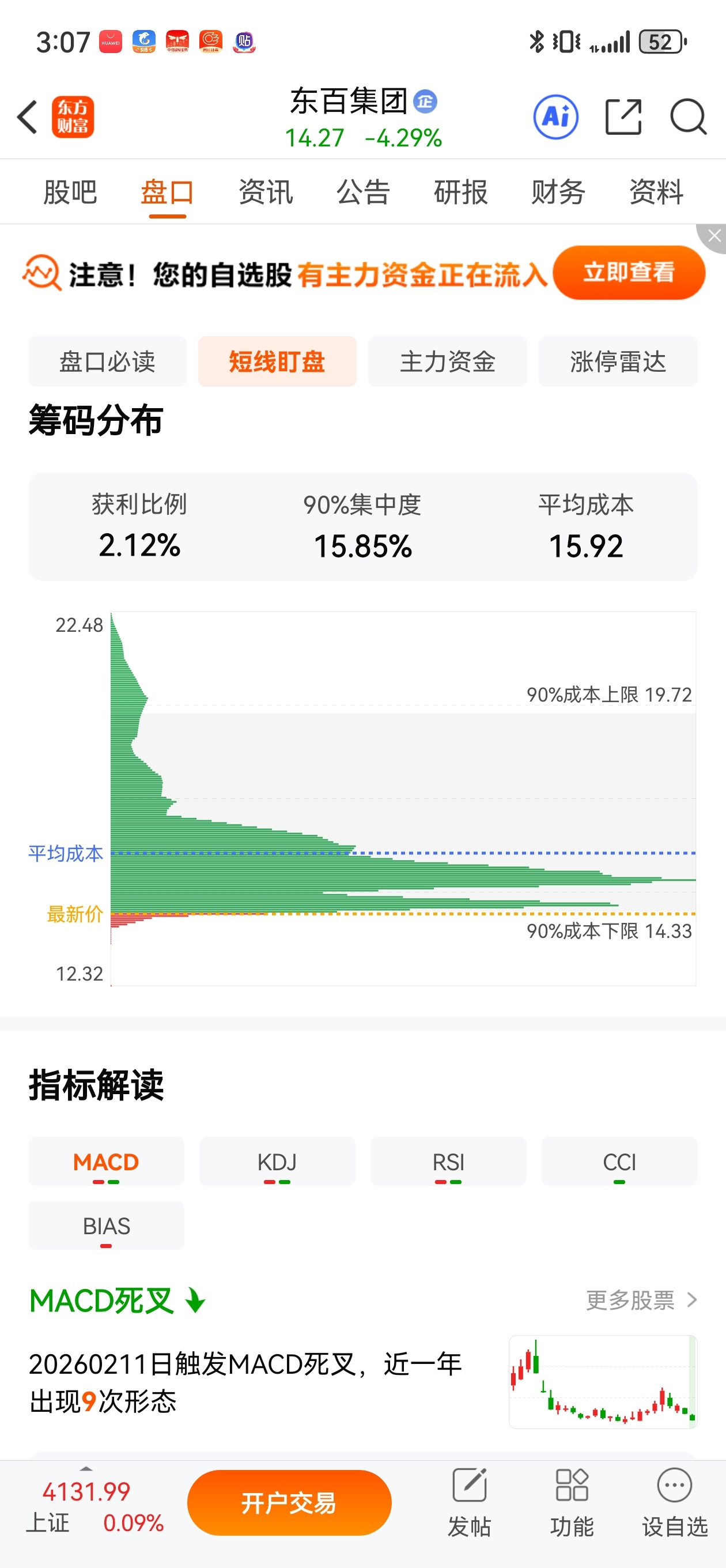 当前获利盘仅有2.12% 也就是98%的人都在亏钱。股价已严重破位