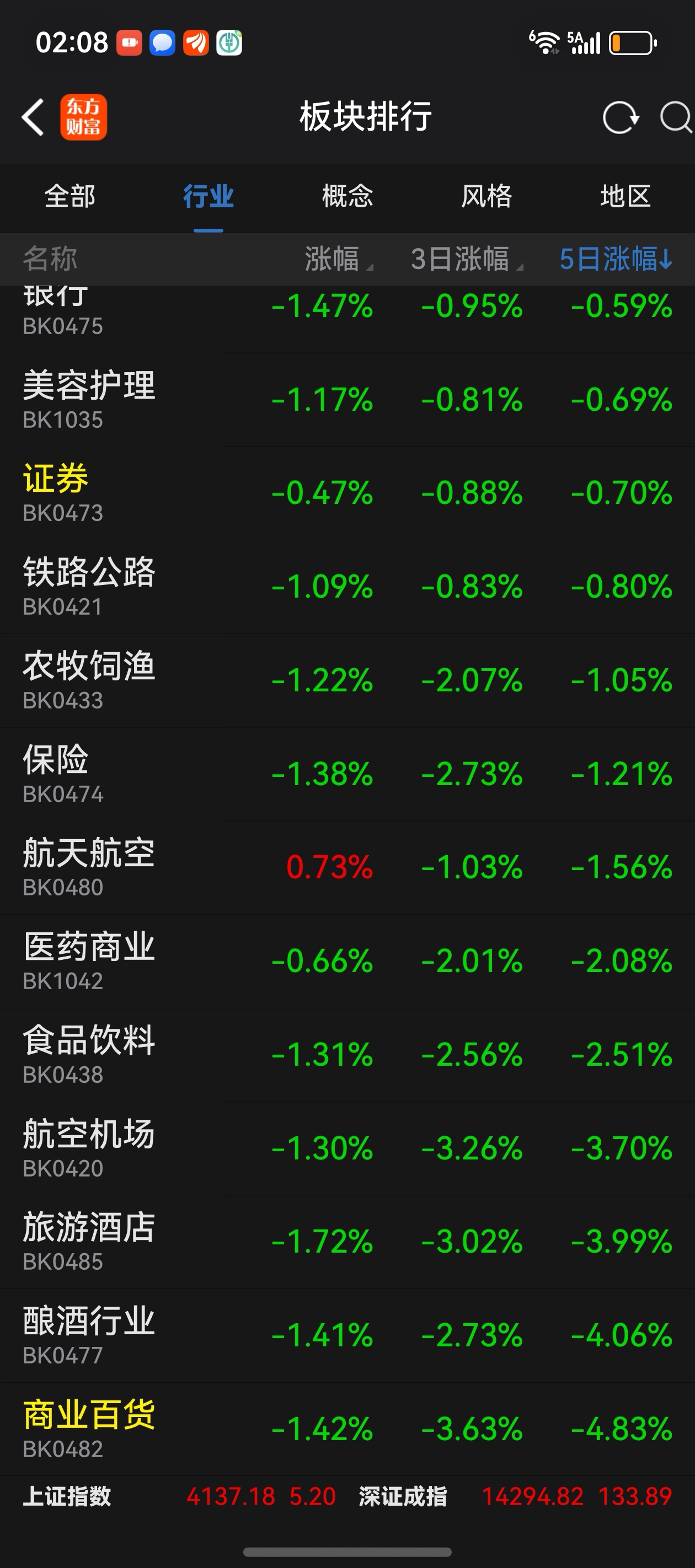 板块、1日、3日、5日跌幅第一,倒数