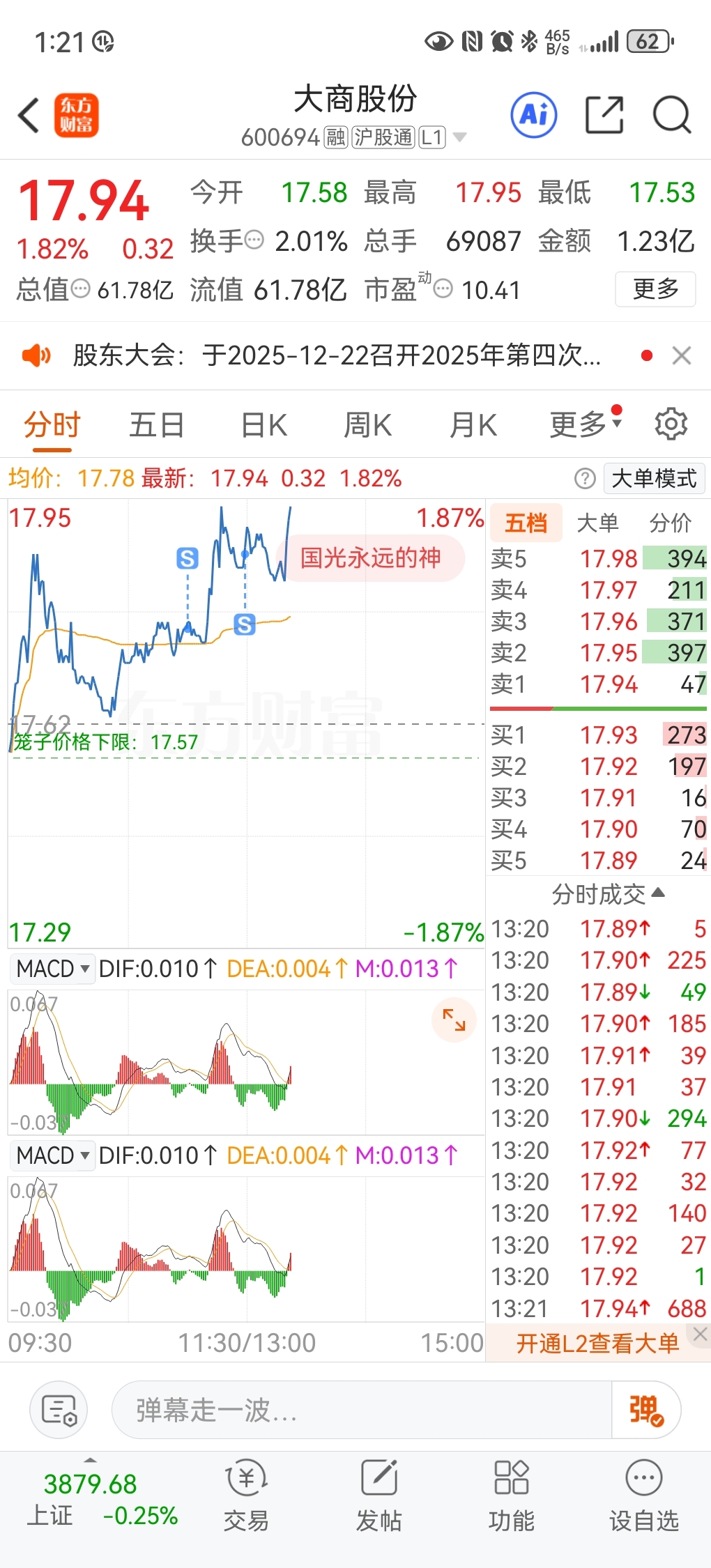 $大商股份(SH600694)$ 要不要这样,又是卖了你就涨,佛了,下次没有18.5坚决不卖!