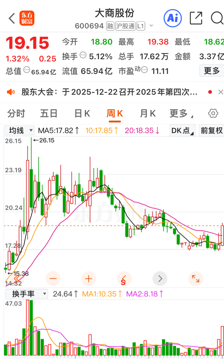 昨晚复盘了大商股份一年来的走势,终于查清近期走势为何弱于大盘。看看大商股份周K线