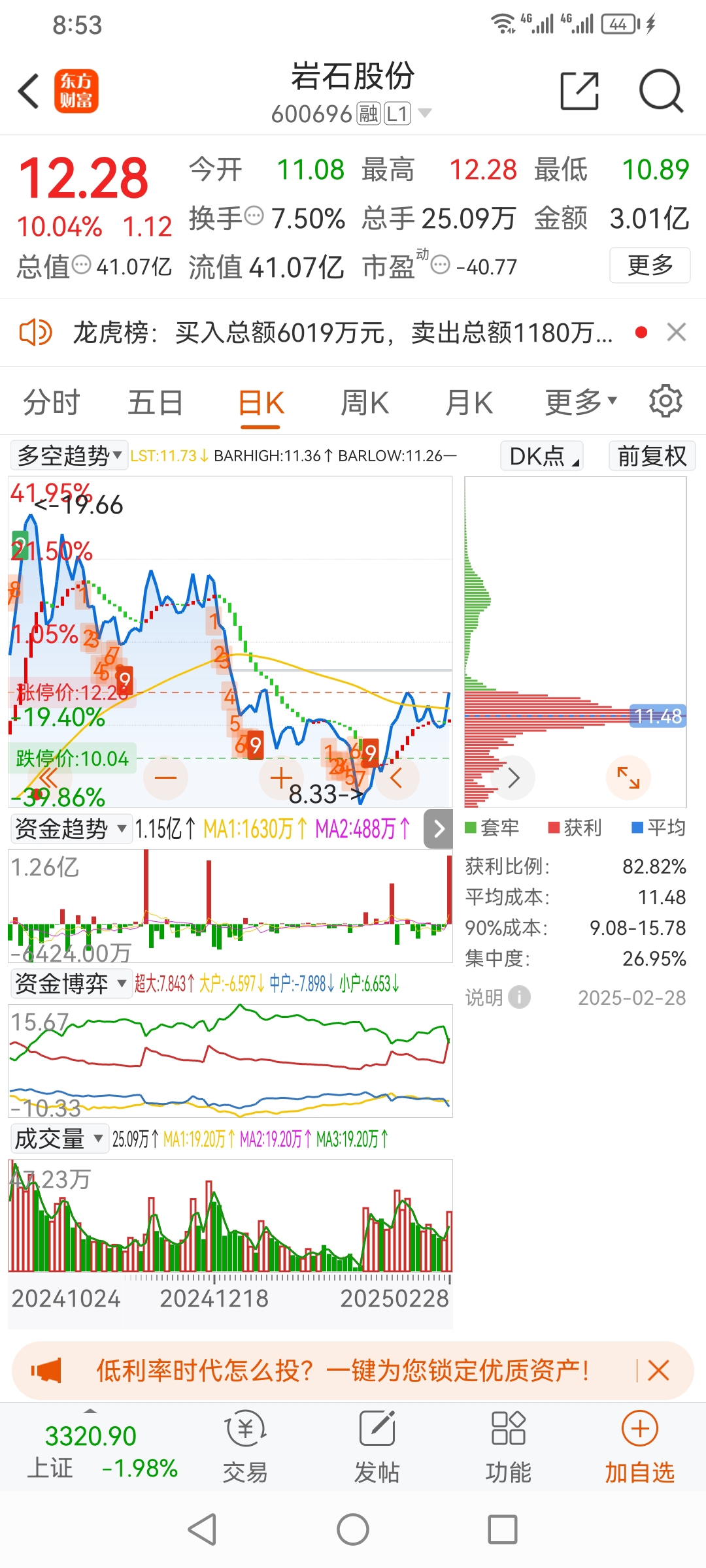 方军上海岩石股份,低位,首板,成交量递增,设置2成仓位试错低买。