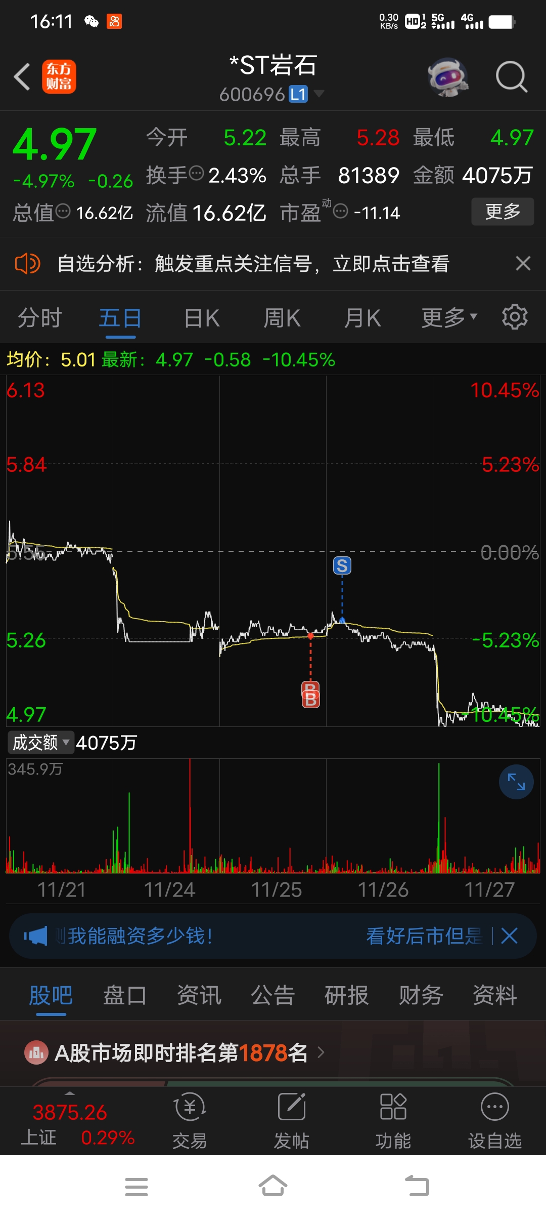 $*ST岩石(SH600696)$ 悄悄告诉各位老铁!!俺带头砸的盘!!!!多来几个地板,我来解救大家