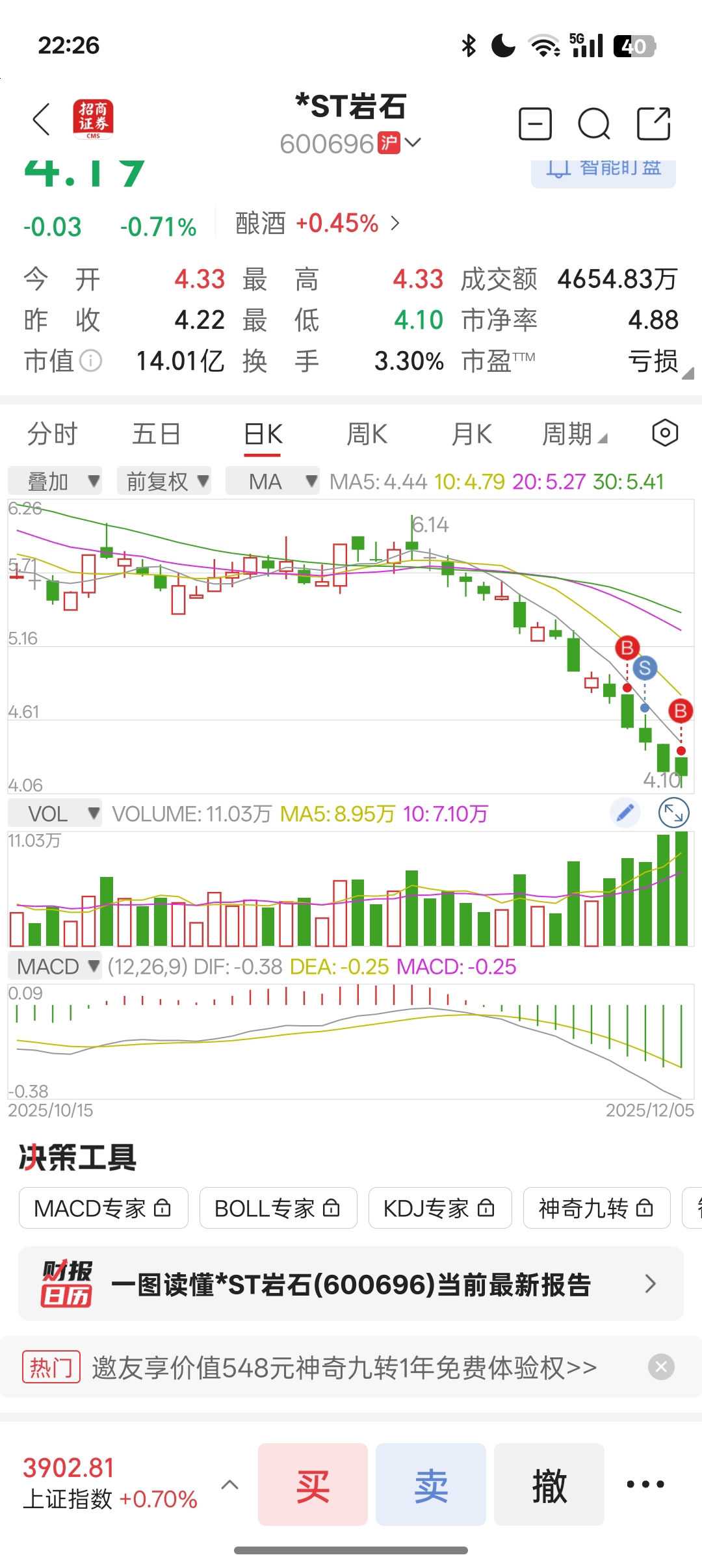 $*ST岩石(SH600696)$ 你卖假酒,我都买因为你是St股票本人不会全仓退市,就当少花点钱,挣钱就对身边人好点心态炒股票