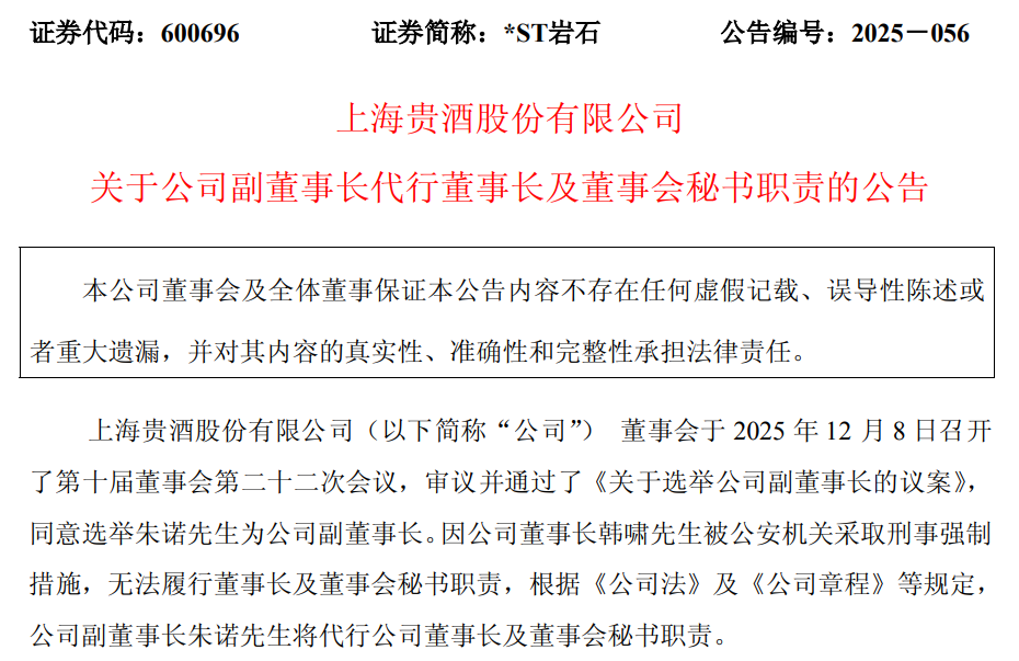 *ST岩石(600696)12月8日晚间公告,公司董事会当日召开了第十届董事会第二十二次会议,审议并通过了《关于选举公司副董事长的议案》,同意选举朱诺为公司副董事长。因公司董事长韩啸被公安机关采取刑事强制措施,无法履行董事长及董事会秘书职责,根据有关规定,公司副董事长朱诺将代行公司董事长及董事会秘书职责.