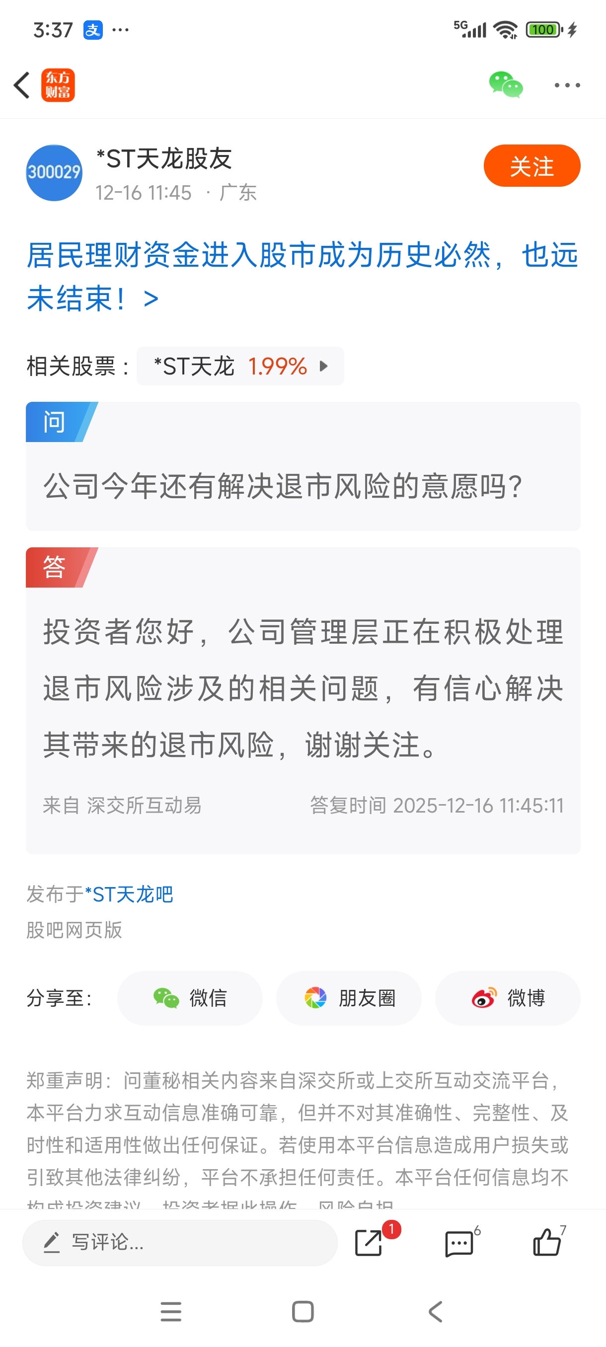 st天龙上午跌了五个点,,上午收盘后董秘回答提问,有信心解决退市问题,下午最高拉