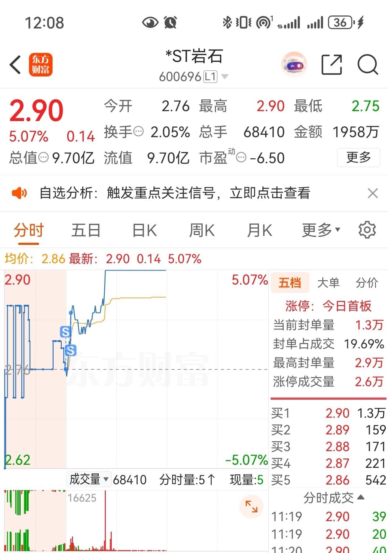 $*ST岩石(SH600696)$ 哎,踏空了,跌的时候si拿,涨一点就卖了,是不是韭菜