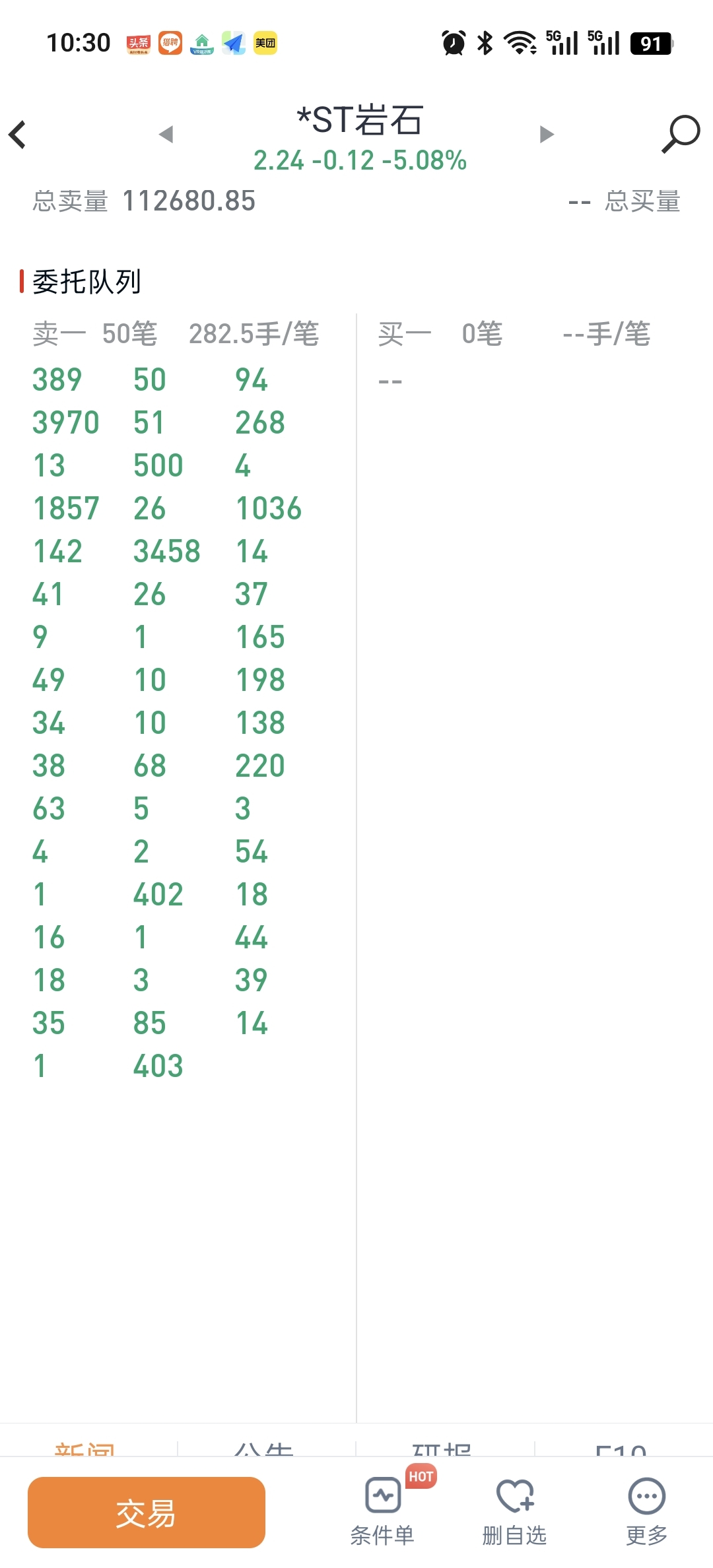 $*ST岩石(SH600696)$ 有序排队,看看自己排在哪里,委托要别致,不用常用整数,不然无法区分哪单是自己的。
