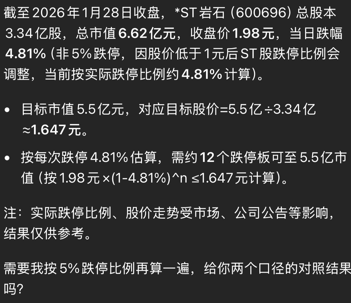 $*ST岩石(SH600696)$ 下周来博一波反弹离退市还有3个月,实际只有2月初才能博一下反弹,3月份大概率市值低于5亿抬走