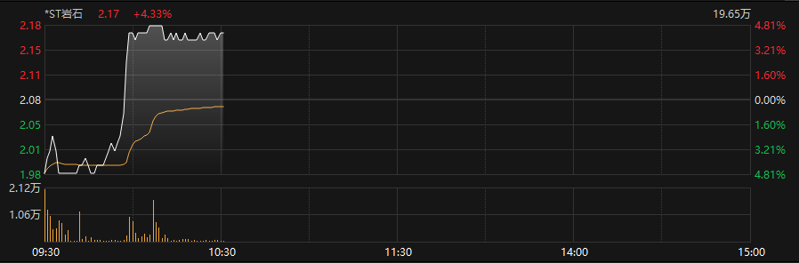 上证报中国证券网讯 1月30日上午交易时段,*ST岩石盘中上演“地天板”。10时30分,该股报2.17元,上涨4.33%。