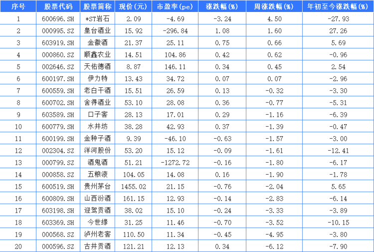 *ST岩石、皇台酒业、金徽酒分别以4.50%、1.60%、0.66%,列白酒A股周涨幅前三。