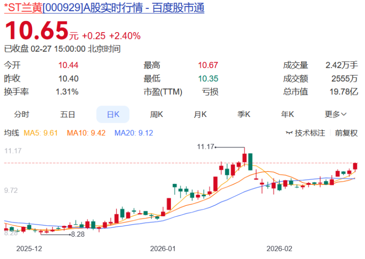 *ST兰黄(兰州黄河企业股份有限公司)报收10.65元,涨2.40%,周涨幅5.34%,列啤酒A股第一,今年以来涨幅-3.55%。