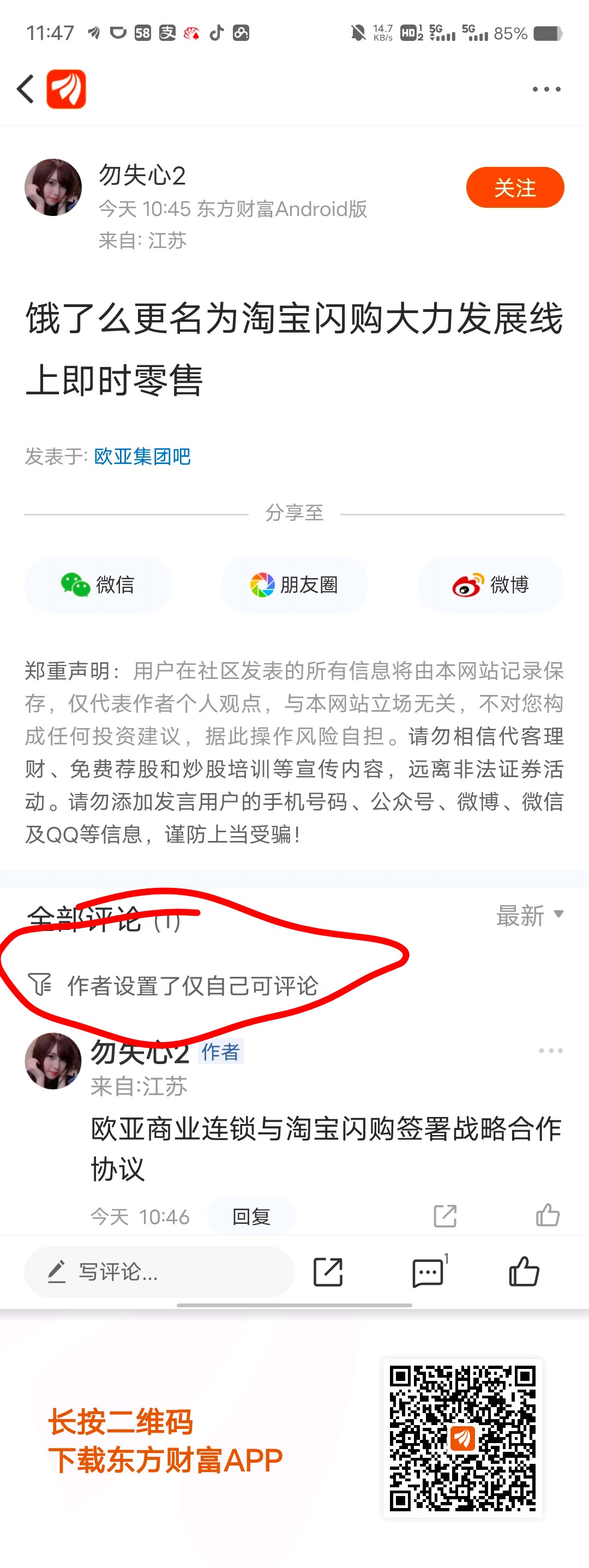 $欧亚集团(SH600697)$ 10月15日的消息,跑到现在这里来吹,还不让评论,还有闪购借壳的,编之前能不能悠着点,我还说沃尔玛借壳呢!