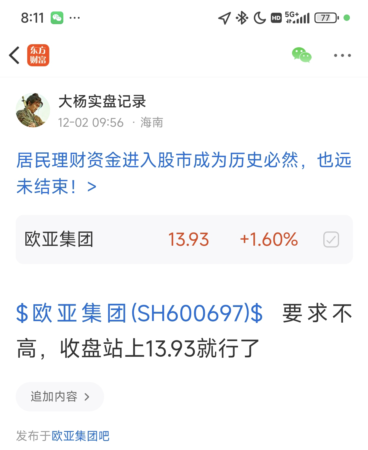 $欧亚集团(SH600697)$ 现在的主力都这么好说话了吗?要不明天拉个涨停试试?让亿万小散歌颂一下主力的功德!