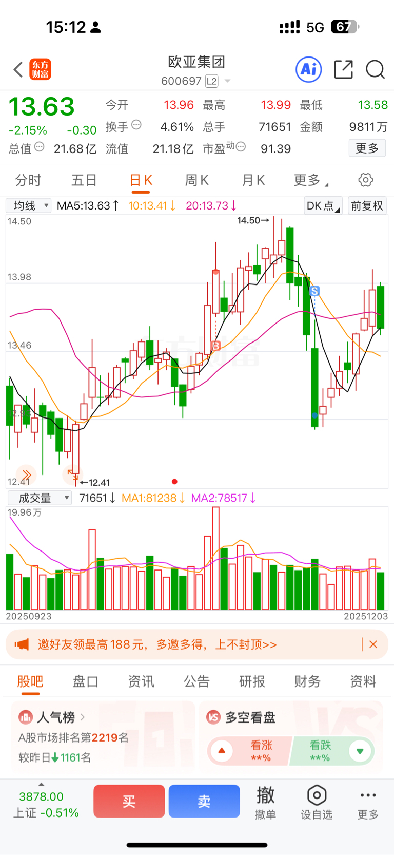 $欧亚集团(SH600697)$ 下次买卖的时候我第一时间发个帖子