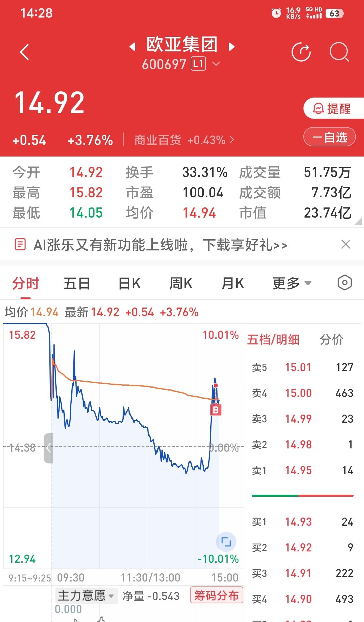 $欧亚集团(SH600697)$ 15.25成本,主力给点力啊
