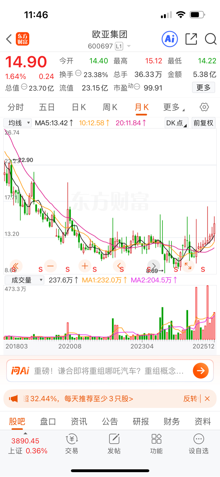 $欧亚集团(SH600697)$ 月线走势多漂亮,下周跨过17元 一路坦途