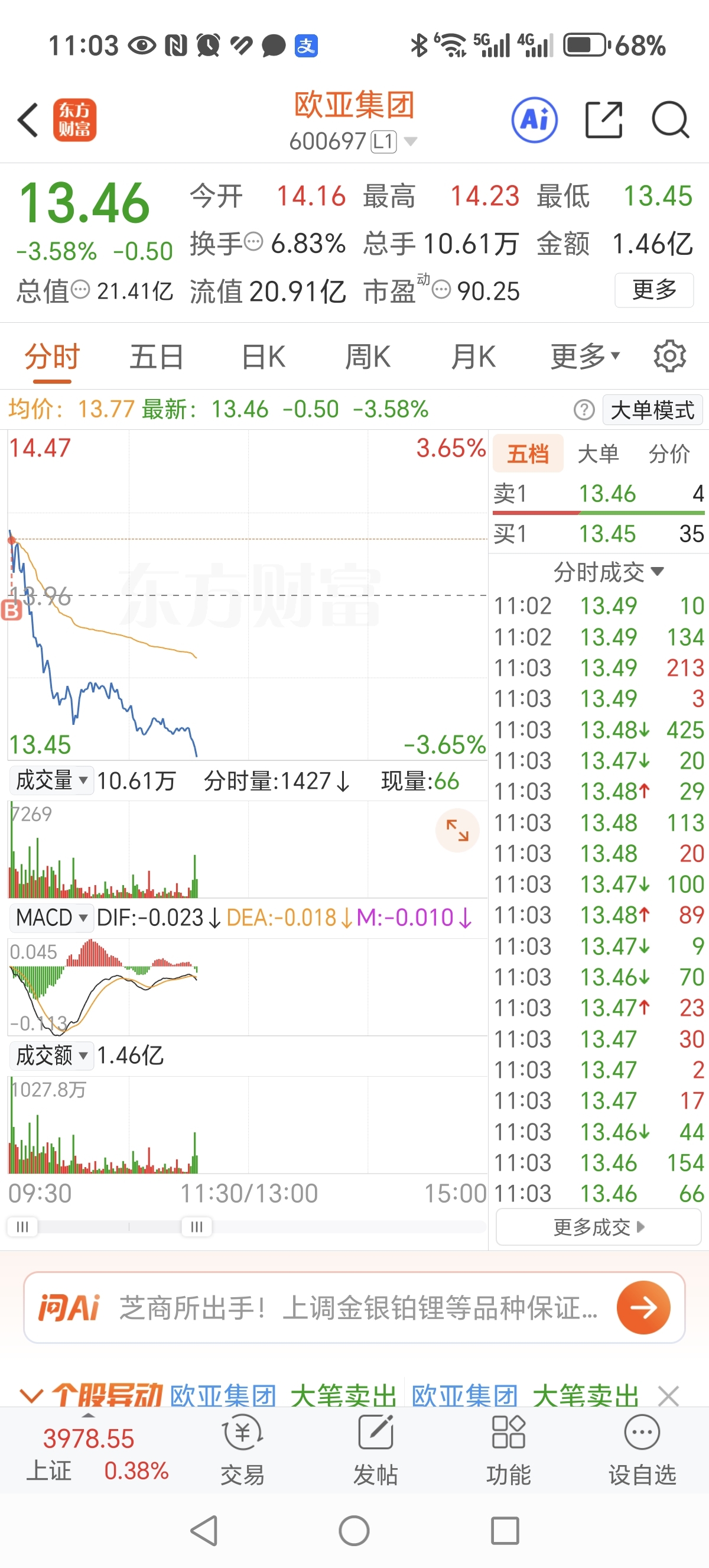 $欧亚集团(SH600697)$ 本来进广百的,高开太多,买了这垃圾