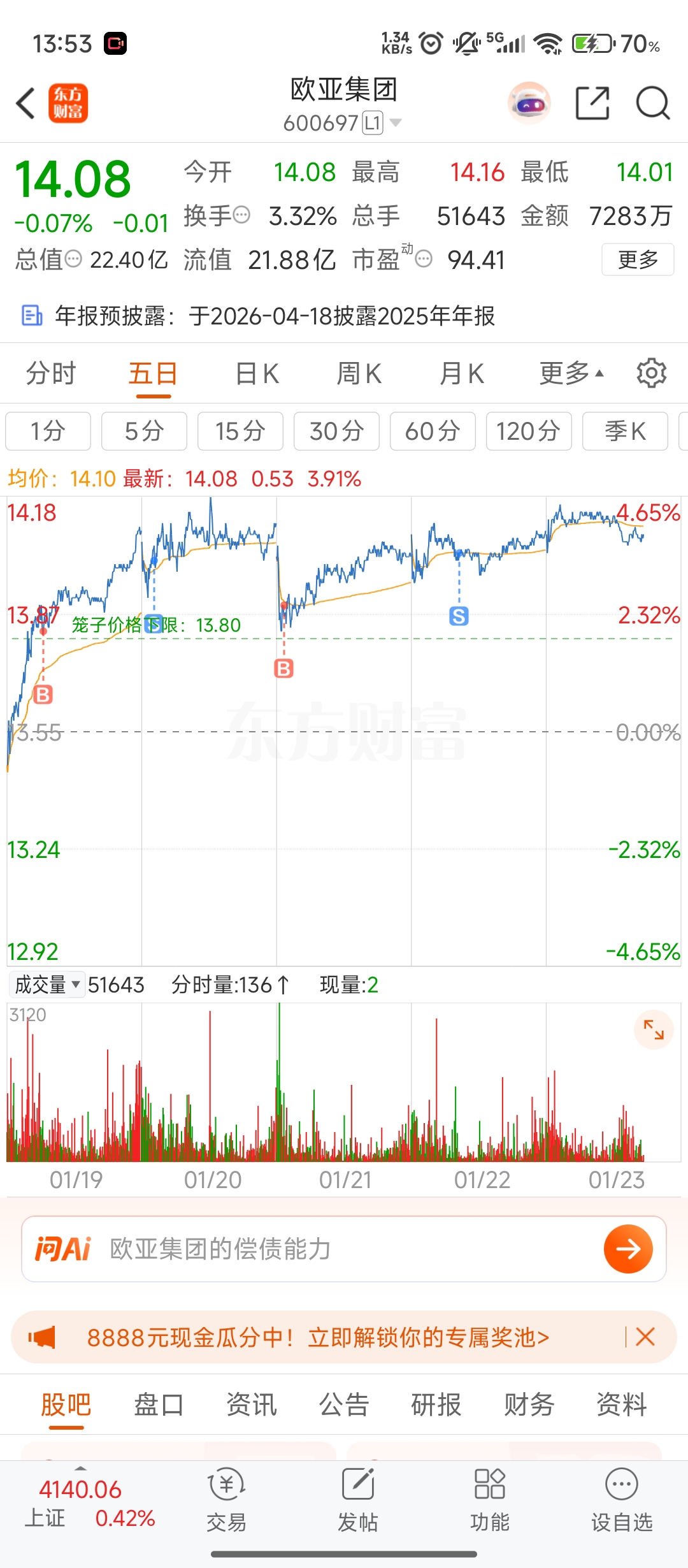 $欧亚集团(SH600697)$ 每天就是反复T一点,反正挣不了大的就是T着玩