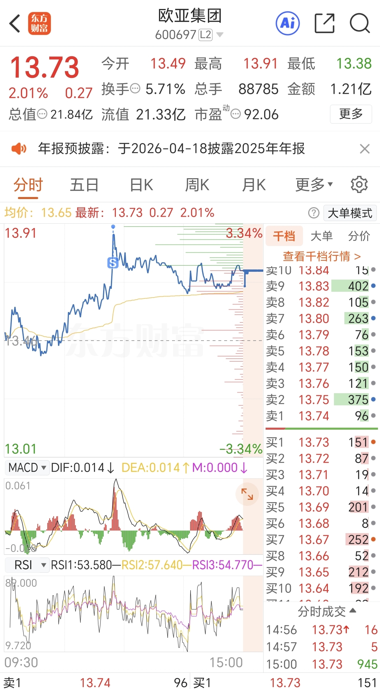 $欧亚集团(SH600697)$ 昨天挂的单!胆小跑了,祝发财#炒股日记# #实盘记录#
