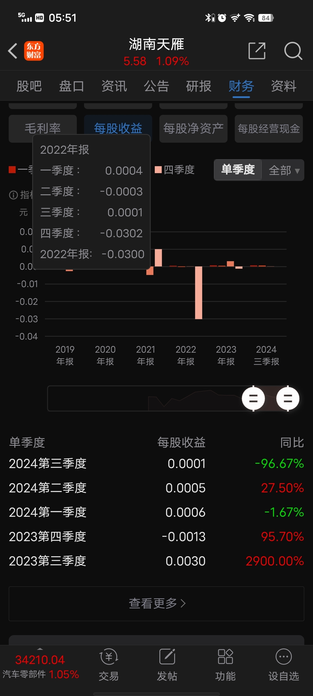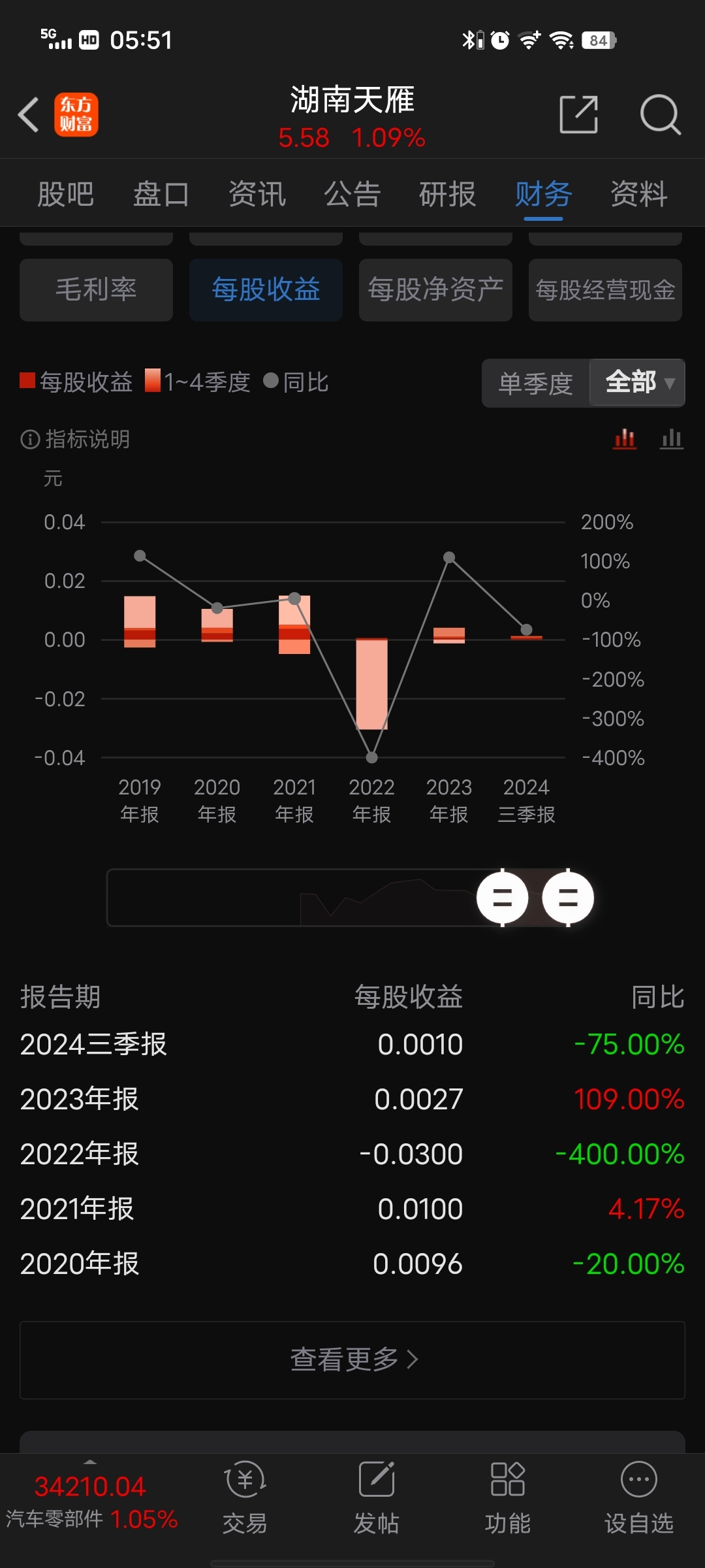 年报无虞2024年1-3季度赢利,四季度有公司全资子公司湖南天雁机械有限责任公司、湖南天雁机电有限责任公司收到的衡阳市土地储备中心支付的全部补偿金额共计4225.38万元。赢利是铁定的。所以持股天雁不会有风险。