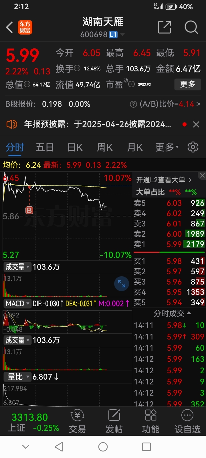 $湖南天雁(SH600698)$