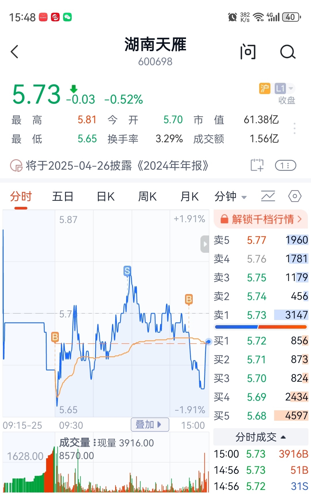 $湖南天雁(SH600698)$ 今天受大盘拖累,天雁大部分时间都在水下振荡,尾盘收出小假阳线,好在各项主要技术指标没有变坏。今日盘内做T降成本,尾盘加仓一层,继续看好天雁!