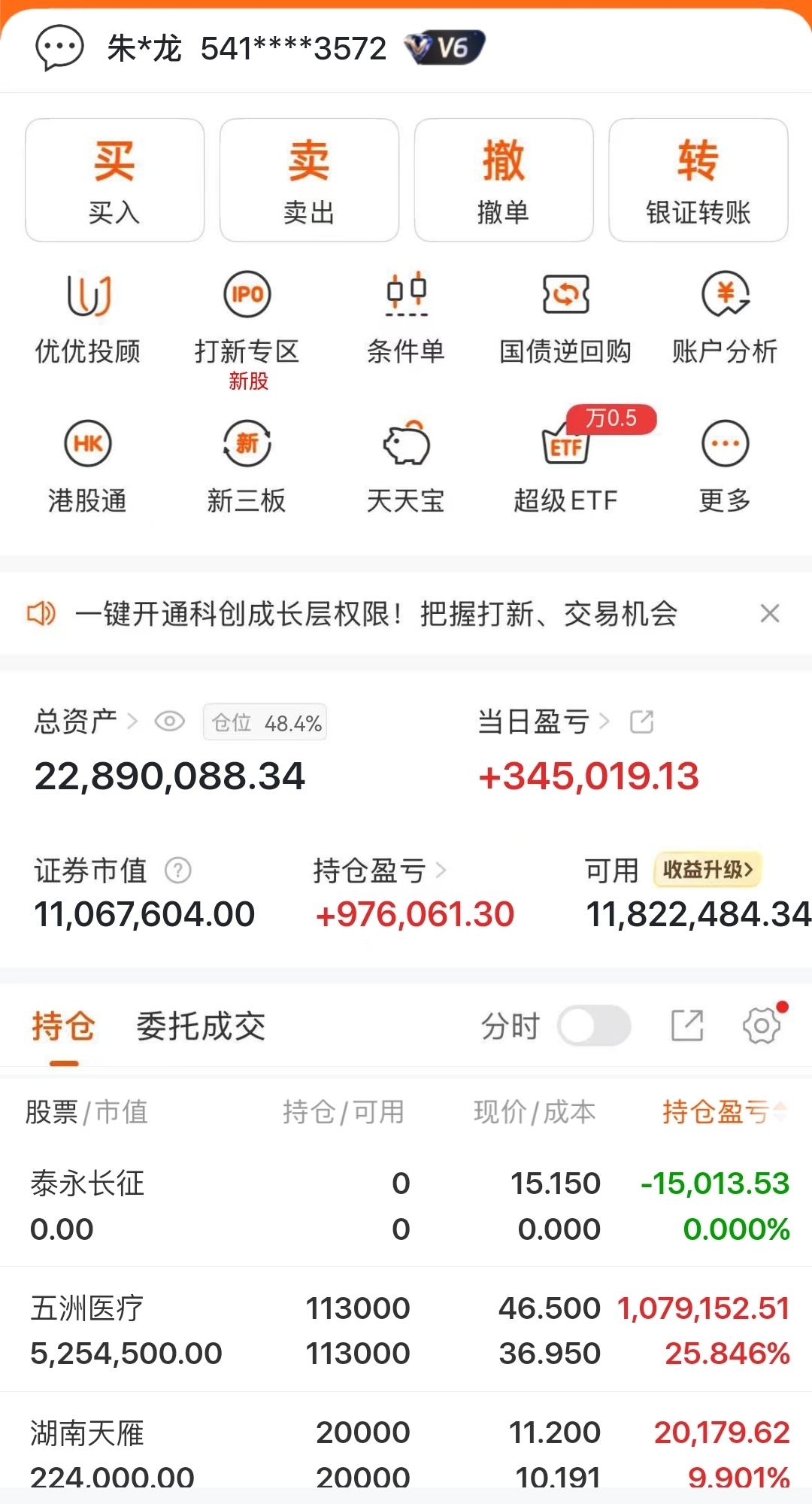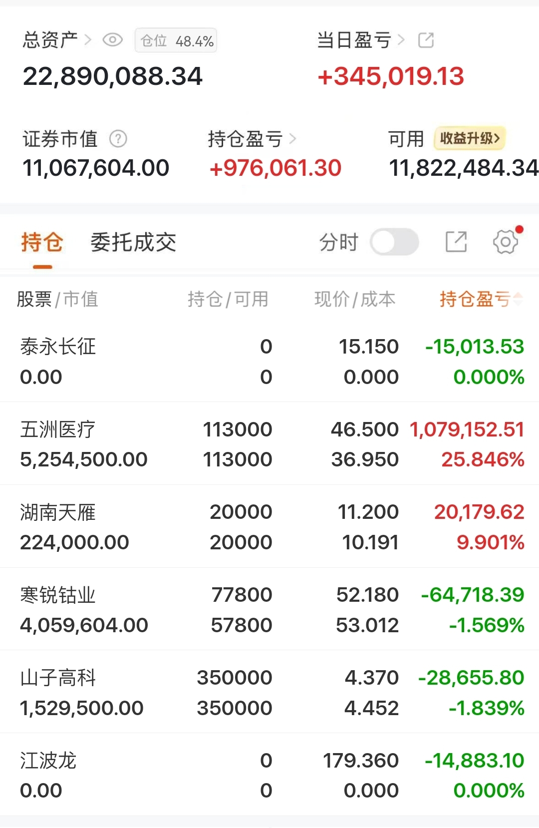 大家中午好,简单几句一下,今日没开新仓,看盘面情况不容乐观。还是想保存实力把不理想标的清除。手上$湖南天雁(SH600698)$ 早些布局目前已经开始盈利了,趋势也已形成坐等丰收即可。$五洲医疗(SZ301234)$ 花好月更圆,一阳穿3线。盈利模式开启。$山子高科(SZ000981)$ 底部量价齐生,关注10日线即可。寒锐钴业:今日低开走上均线上方,下穿20日线补了一手。但愿大盘给给力!
