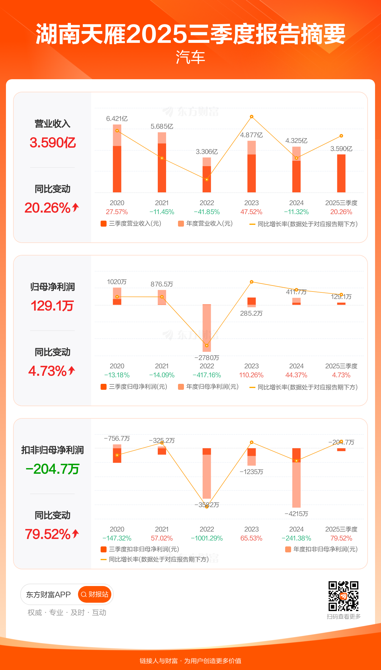 湖南天雁10月31日发布2025年三季报显示,公司前三季实现营业收入3.59亿元,同比增长20.26%;归母净利润129.14万元,同比增长4.73%;扣非归母净利润-204.71万元。