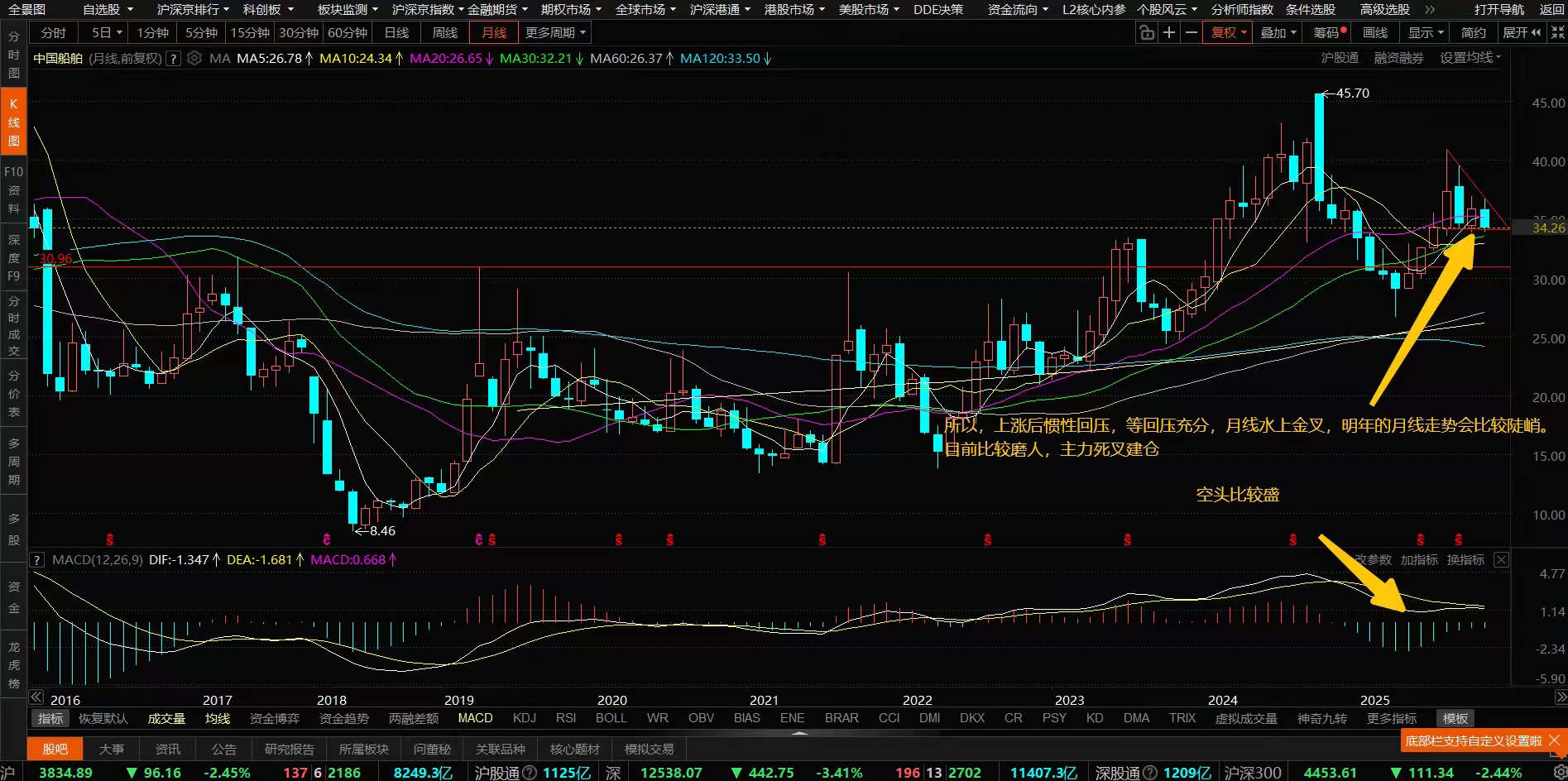 船舶走了9笔下,9笔上,目前5笔下,最好再走4必或者2比,达到30~32附近,结构基本完整了,有望走出2026年的月线主升浪