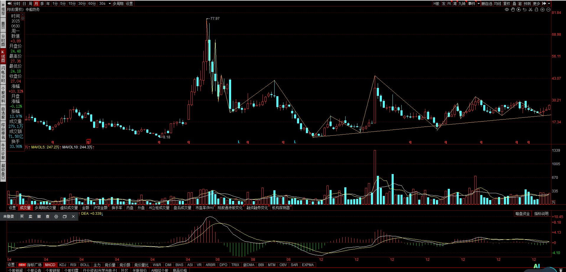 $中船防务(SH600685)$下跌结构完整,44为立杆阳,后面吸筹,924缩量继续吸筹,打掉44后面就厉害了。按照5月线位置低吸,12月回踩5月线,过34.3高点,后面就是月线级别的行情