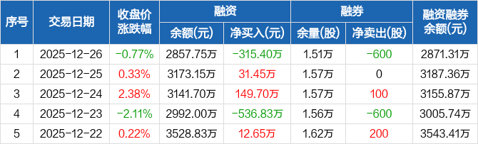 湖南天雁:融资净偿还315.4万元,融资余额2857.75万元(12-26)