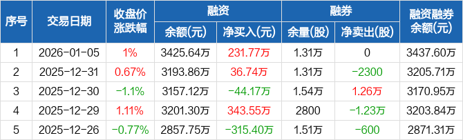 湖南天雁:融资净买入231.77万元,融资余额3425.64万元(01-05)