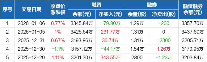 湖南天雁:融资净偿还79.8万元,融资余额3345.84万元(01-06)