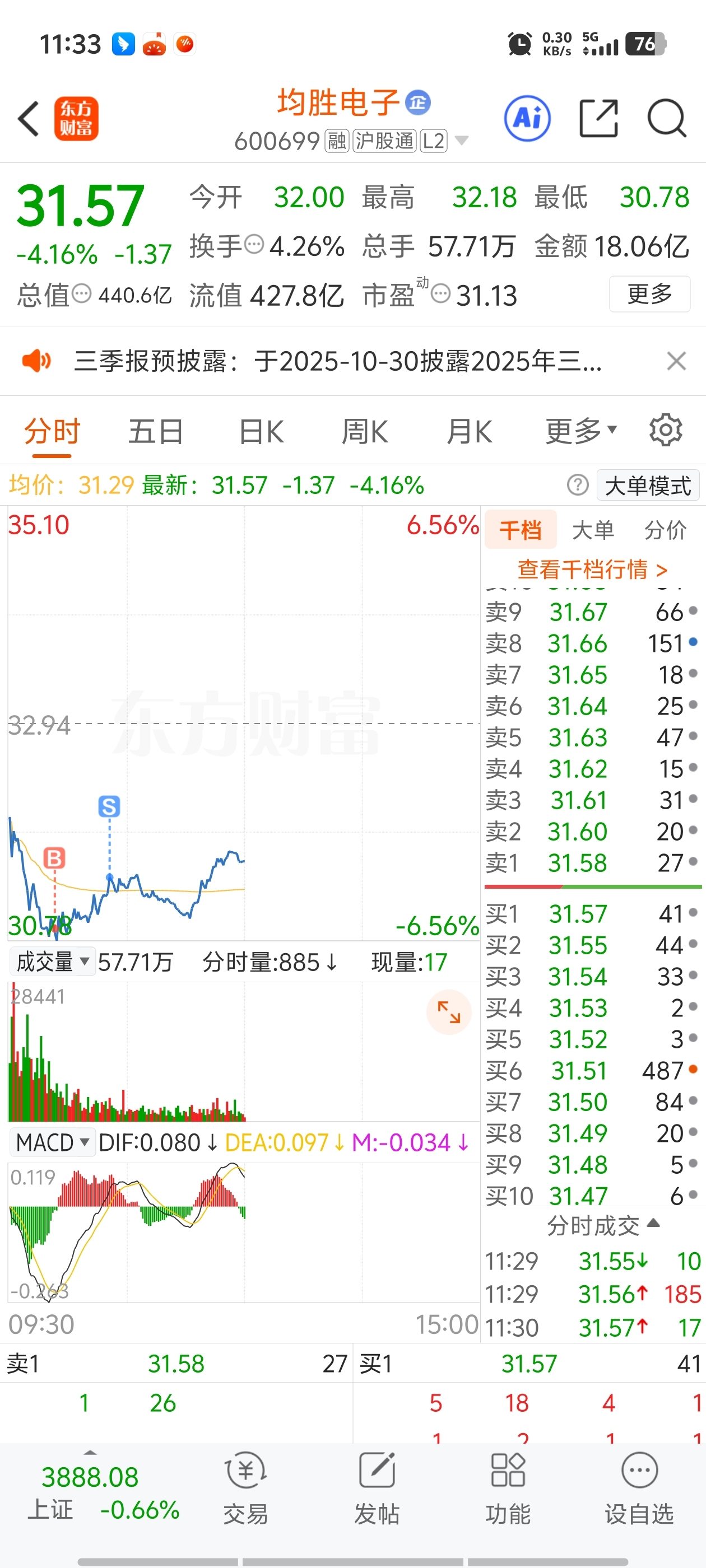 $均胜电子(SH600699)$ 30.9买,31.41卖,t了5毛,昨天33买的,没事给自己找事了