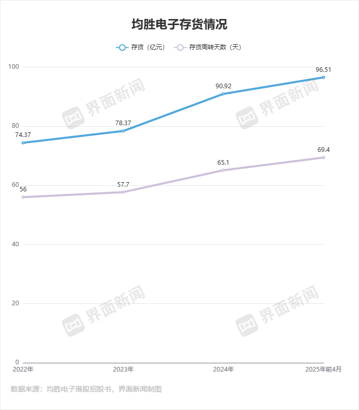 均胜电子近年来存货风险增大。招股书披露,2022年至2024年及2025年前4月,公司存货分别是74.37亿元、78.37亿元、90.92亿元及96.51亿元,存货周转天数分别为56天、57.7天、65.1天和69.4天,分别确认存货撇减4470万元、9950万元、1.26亿元、4400万元。“公司整车厂客户的某些车型销售额增长放缓,进而导致需求减少。”均胜电子解释称。