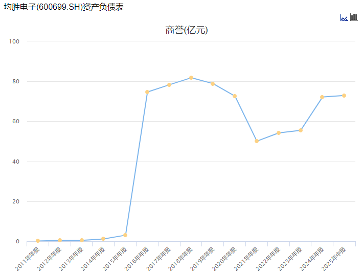 2021年,公司对汽车安全事业部相关资产组的商誉计提减值约20.2亿元,导致当年亏损37.53亿元。截至2025年6月30日,并购为均胜电子带来的商誉金额达到72.93亿元,占当期净资产的比例约为35.04%。