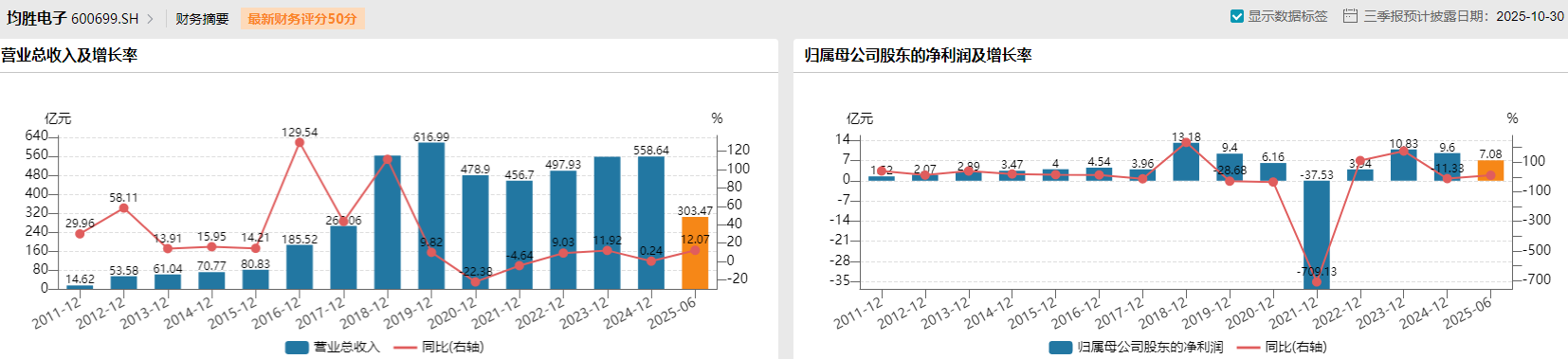 从2011年到2024年,均胜电子的营收从14.62亿元涨至558.64亿元;其归母净利润从上市之初的1.52亿元拉升至2024年的9.6亿元。2025年上半年,公司实现营收303.47亿元、归母净利润7.06亿元。