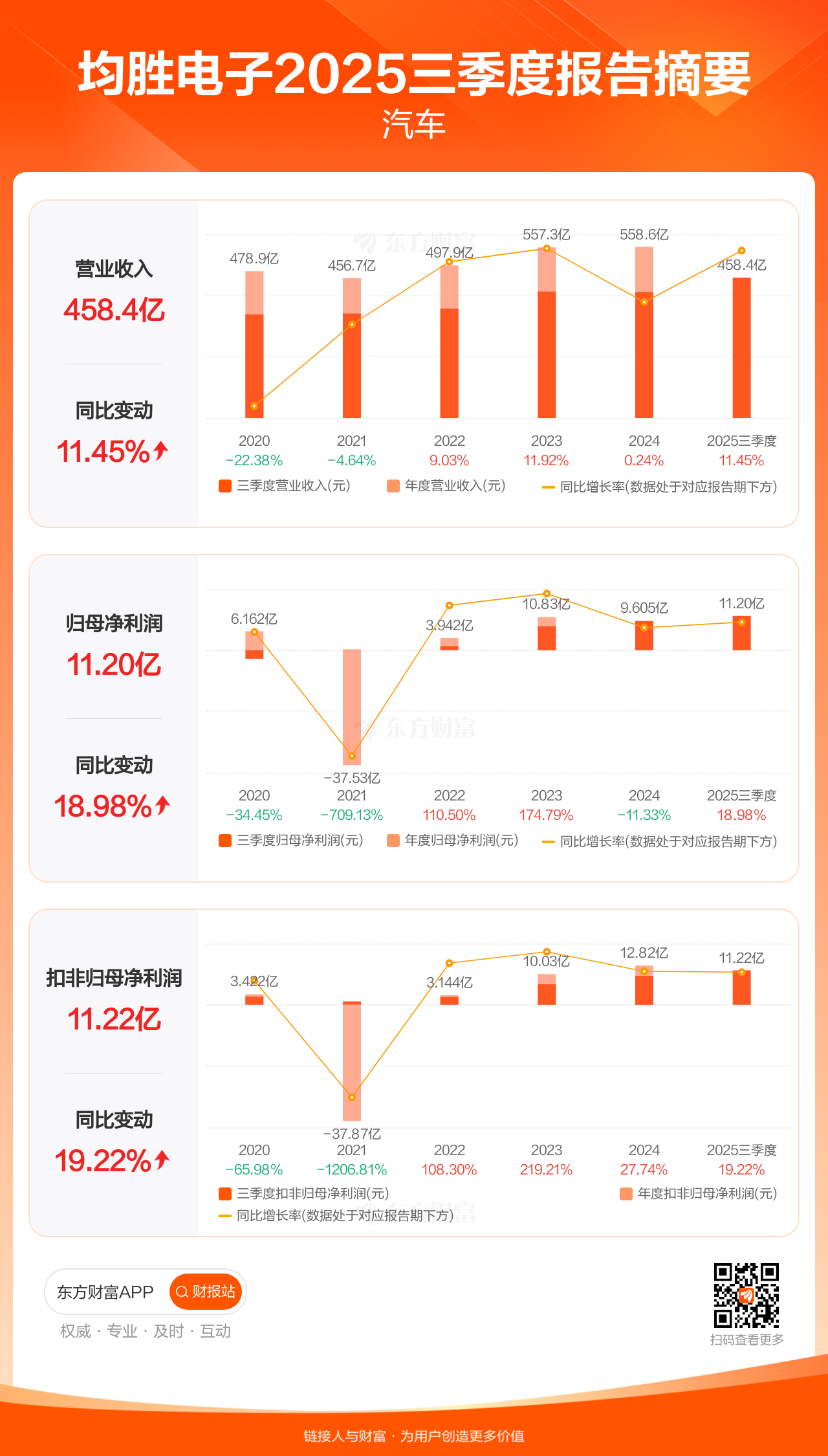 均胜电子10月30日发布2025年三季报显示,公司前三季实现营业收入458.44亿元,同比增长11.45%;归母净利润11.20亿元,同比增长18.98%;扣非归母净利润11.22亿元,同比增长19.22%