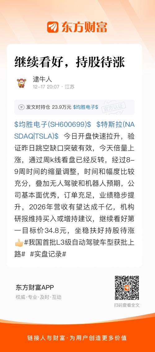 $均胜电子(SH600699)$ $特斯拉(NASDAQ|TSLA)$ 今日开盘快速拉升,验证昨日跳空缺口突破有效,今天倍量上涨,通过周k线看盘已经反转,经过8-9周时间的缩量调整,时间和幅度比较充分,叠加无人驾驶和机器人预期,公司基本面优秀,订单充足,业绩稳步提升,2026年营收有望达成千亿,机构研报维持买入或增持建议,继续看好第一目标价34.8元,坐稳扶好持股待涨