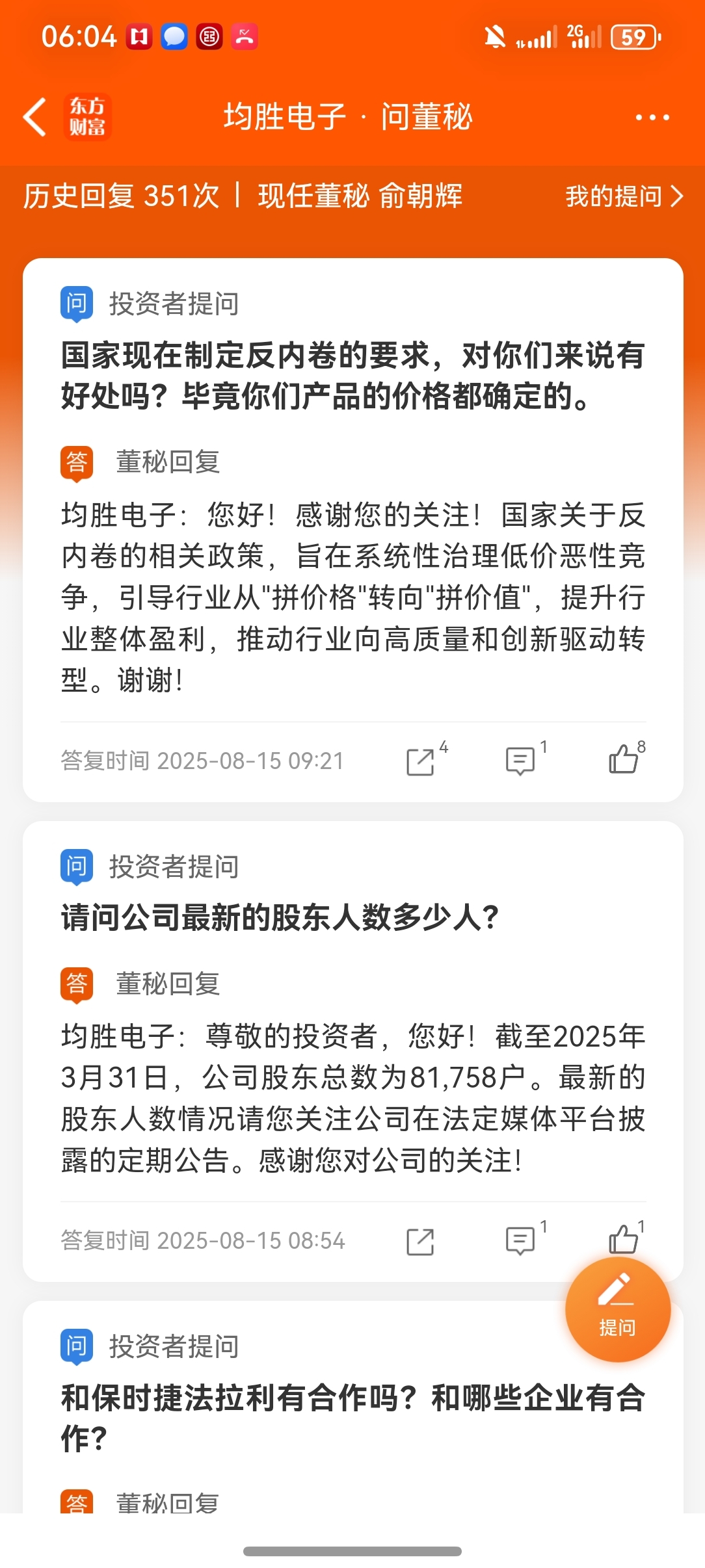 $均胜电子(SH600699)$ 这公司能买么?看看这些屁事不管的董秘,回复还是8月的。