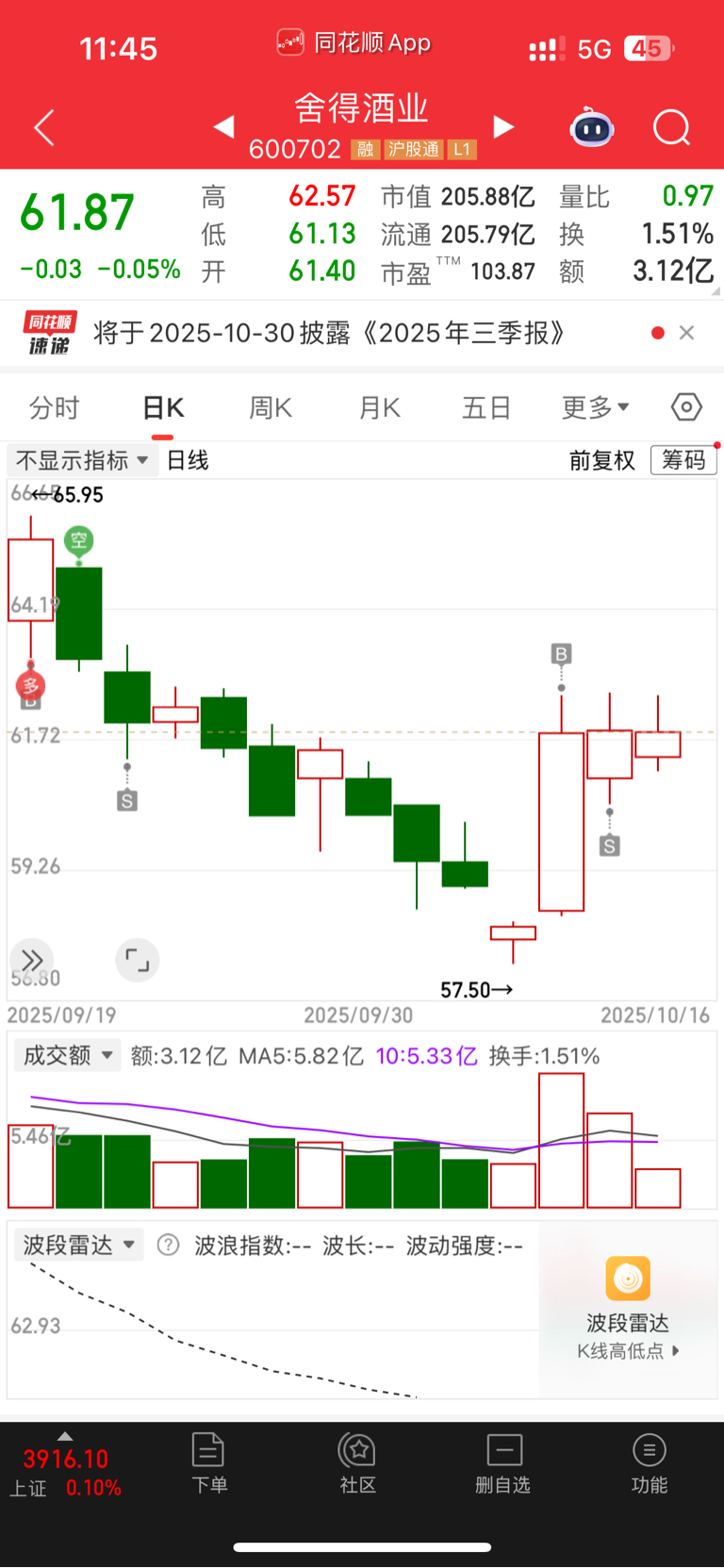 $舍得酒业(SH600702)$ 昨天减了2c仓位,兄弟们能上70吗?在待一周没起色,白酒仓位拿来加仓其他了