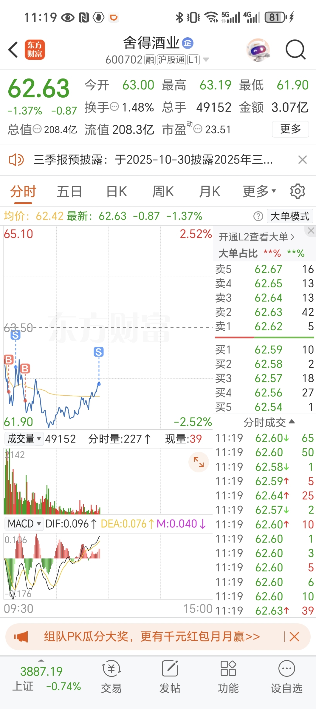 $舍得酒业(SH600702)$ 今天完成,如果主力打到54附近就再加半仓,打不到就做t降低成本