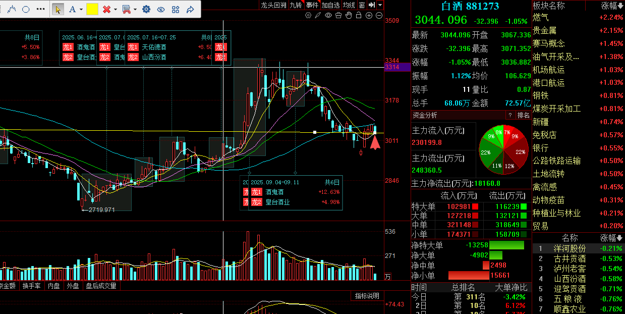 白酒板块现在下方有强支撑,各行各业都在向好。虽然今天跌了一点,白酒板块应该也是今年下半年的一个热门板块