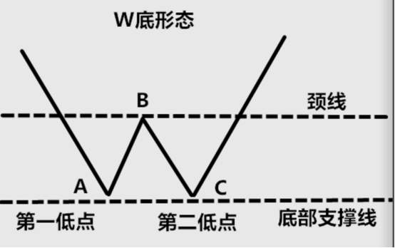 关键线:颈线(B对应的水平价格位)、底部支撑线(A和C的连线)。