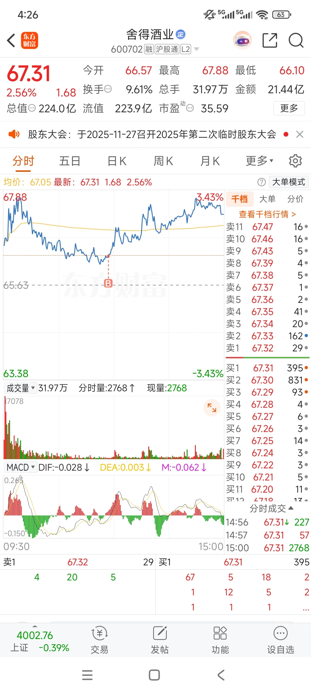 $舍得酒业(SH600702)$ 舍得酒昨天长得太快了,没机会进,今天找个低点进场了。我的目标是70~71短线,我就是做短线隔日冲。