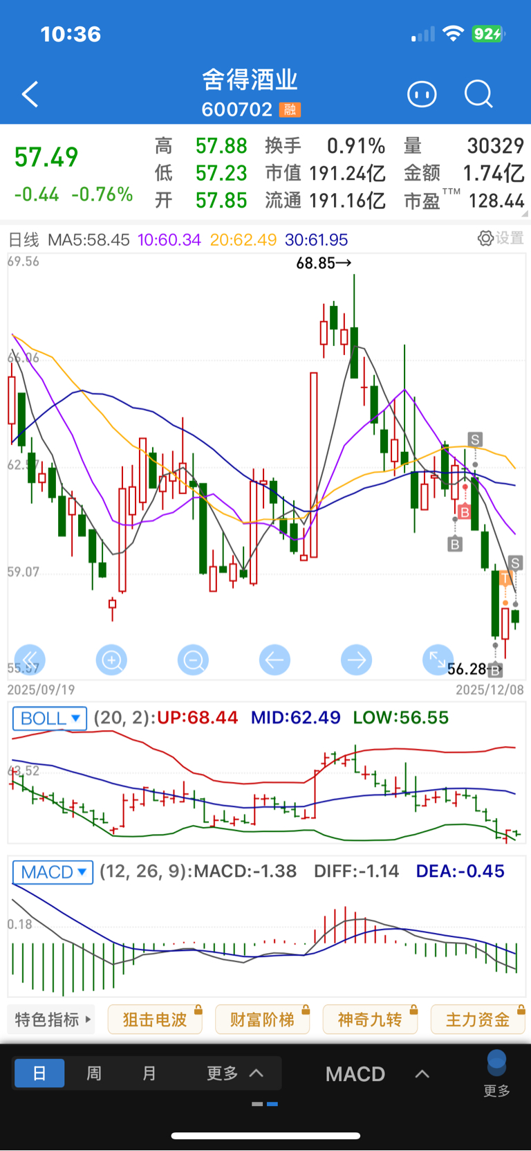 $舍得酒业(SH600702)$ 第一次1000股还好走的快 割了1300、第二次买了400股、今天这么弱走了赚了300、 总账几天一共亏了1000大洋、 不会再买了 , 留下的发财