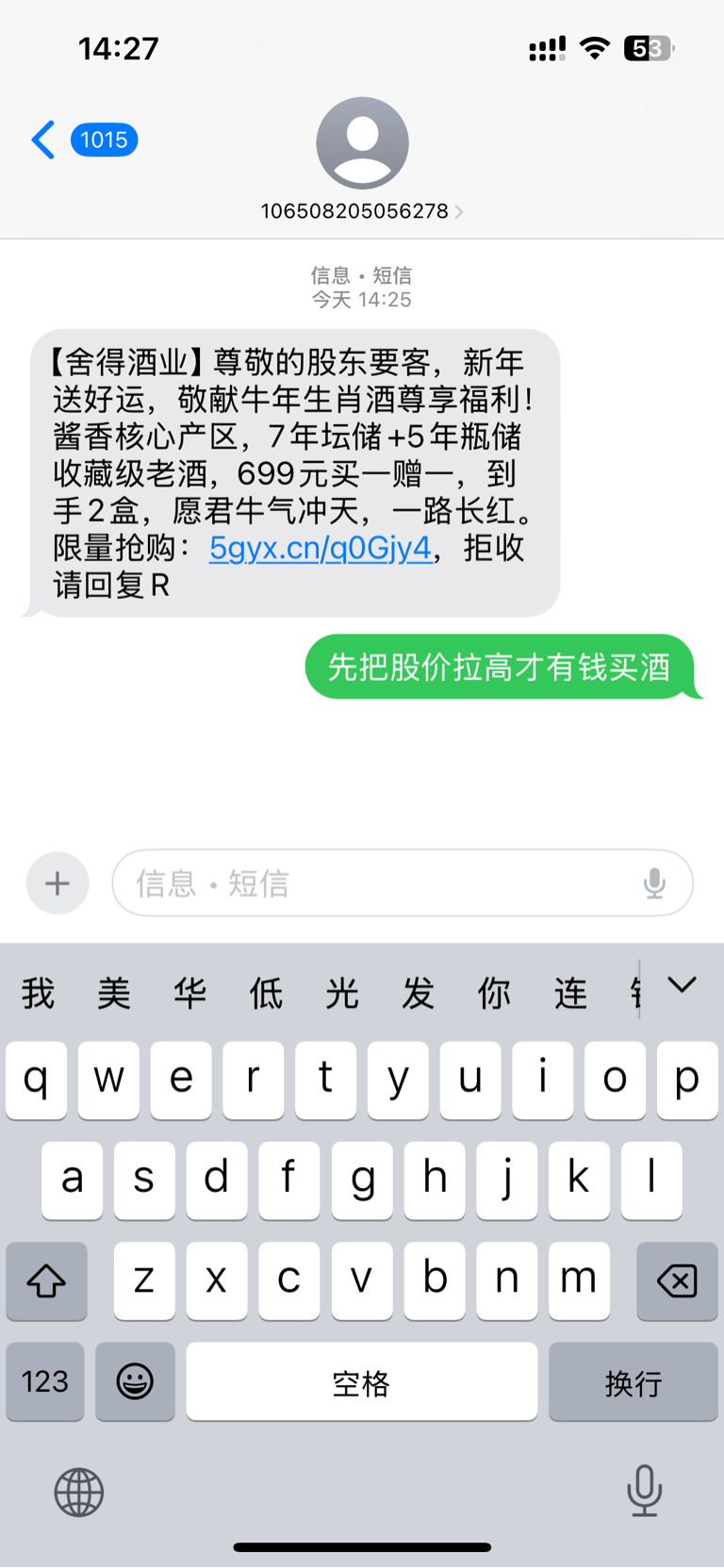 $舍得酒业(SH600702)$ 各位股东门,你们收到推销酒的短信了吗?