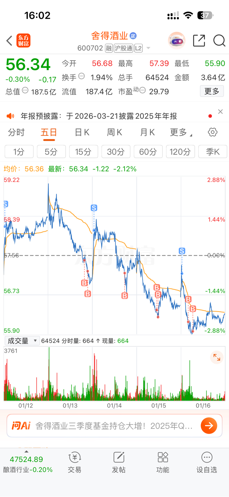 $舍得酒业(SH600702)$ 舍得主力。我是坚定的持股者,我的欲望不高。每天t个菜钱就可以,我知道你还会往下砸,你再砸我就不准备买了,嘿嘿。坐等你上来,再开始网格交易